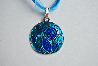 Ladies Designer Blue Geometric Design Necklace on Blue Ribbon Rope Cord.