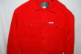 Boss Designer Red Denim Jacket, Size: Medium, Size" Large, Two Flap Chest Front Pockets, Two Hand Side Pockets, Metal Buttons, new with tags. SRP:$ 110.00