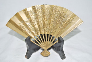 Bronze Oriental Fan Sculpture with Black Wooded Base. 6"W x 5"H.
