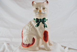 Playful Ceramic Cat Sculpture, Hand Painted, 8.5" high.