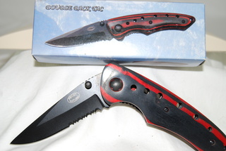 Frost Cutlery - Double Back Tac Knife, # 18-345RPW. 7.5" Open, Black Sawtooth Blade, Black Back Clip, Red Pakkawood Handle, Finger Lock Release.