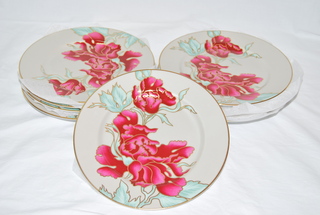 Fitz & Floyd Vintage Fine China Dessert Plates. Deauville Peony Design, 24K Gold Trim. Set of 8.
