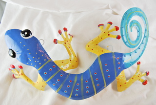 Collectable Gecco Lizard - Nantucket Metal Art, Wall Hanging with Moveable Legs, Blue, Yellow & Red Dots. 17" L. & 9" W.