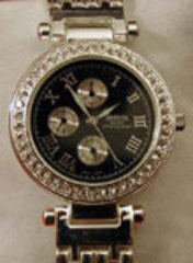 Men's Geneva Elegante Silver Tone Quartz Watch with CZ Accents black face and Bezel with bracelet style band.