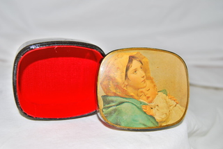 Collectable Handpainted Decorative Box with Handpainted Mother & Child Lid, Collectors Keepsake, Red Lining. 2.5" W x 2" H.