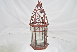 Decorative Wrought Iron & Glass Candle Holder, Includes Votive Candle. 9"H x 4"W. Six Sided.