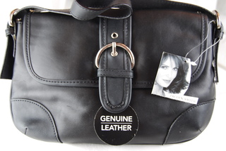 Jaclyn Smith Ladies Designer Black Leather Handbag with Adjustable Strap & Chrome Buckle.