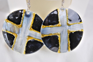 Ladies Designer Black Shell Painted Design with White & Gold Cross Pierced Earrings. 2 1/2 Diameter.