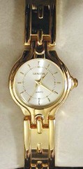 Geneva Ladies Designer Gold Tone Quartz Watch with White Face, beautiful bezel and bracelet style band.