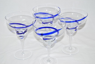 Set of 4, Designer Margarita Glasses with Blue Swirl Design. 7"H x 5"W.