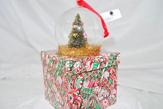 Martha Stewart Hand-Blown Glass Christmas Ornament with Decorated Christmas Tree Inside, Gold Tinsel Trim in a Decorative Candy Cane Box.