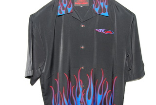 Easy Rider Men's Designer Casual Shirt, 2XL, Black with Red & Blue Flames, Skull and Cross Bone Buttons with Red CZ Accented Eye Stones, Short Sleeve, 100% Rayon, new without tags, SRP:$ 95.00