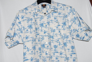Route 66 Men's Designer Casual Shirt, 3XL, White with Blue and Grey Hawaiian Design, Short Sleeve, Front Pocket, Wooden Buttons, 100% Rayon, new without tags.