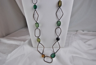 Ladies Designer 30" Geometric Metal with Green & Gold Beads Necklace.