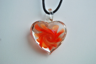 Ladies Murano Pendant Necklace: Hand-Blown Glass in Heart Shape with White, Green and Pink Swirl Design on 18" Rope Cord.