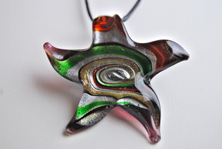 Ladies Murano Hand-Blown Glass Star Design, Clear, Green, Black & Gold Metallic Pendant Necklace on 18" Rope Cord.