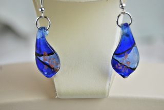 Ladies Murano Hand-Blown Glass Blue, Black & Gold Metallic Tear Drop Design.Pierced Earrings