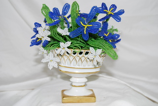 White Porcelain with Handpainted 14K Gold Trim Vase. Hand Woven Beaded Flowers, Blue and White Flowers with Green Leaves.