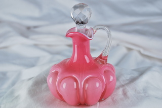 Collectable Rose Color Colored Pitcher with Clear Glass Handle & Cut Crystal Stopper. 6" H x 3" D.