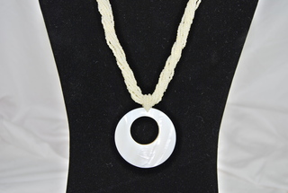 Ladies Designer White Circular Natural Sea Shell with White Beads Necklace, Adjustable Lobster Clasp, Twist Beads for Different Design Effects.