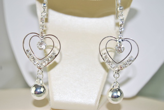 Ladies Designer Swarovski Crystal Pierced Earrings with Double Heart Dangle and Silver Ball Design.