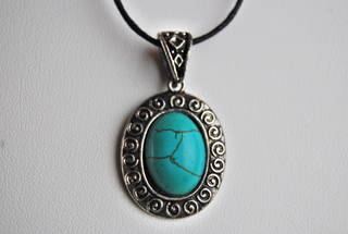 Ladies Designer Turquoise & Silver Oval Design Necklace with Black 20" Rope.