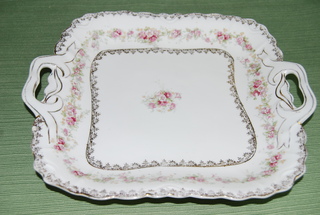 Victoria Austria # 318 in Gold, Vintage Square China Serving Platter with 24K Gold Accented Handles. White Porcelain with Pink Floral Design. 9.5" Diameter.