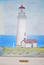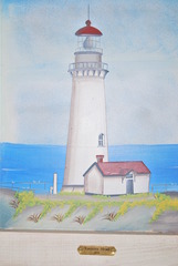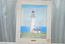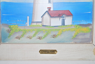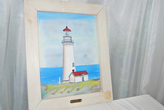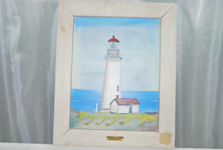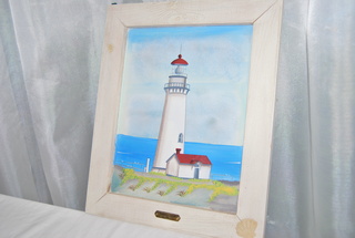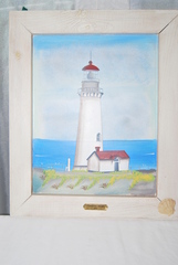 NEW BEAUTIFUL YAQUINA HEAD LIGHTHOUSE SCENE 1873 FRAMED PAINTING IN A WHITE WASHED WOODEN FRAME WITH INSET SEA SHELL ACCENT. MEASURES: 16" HIGH x 13" WIDE x 1" THICK, INCLUDES FREE SHIPPING